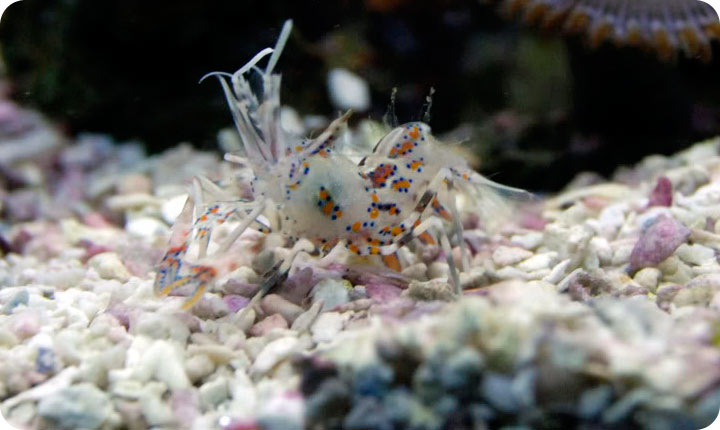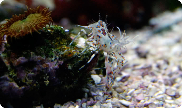 Phyllognathia ceratopthalma are tiny, cryptic shrimp that are true gems of the ocean. They are small and typically only grow up to one inch as adults. They are very slow moving and usually crawl sideways like a crab. However, if they feel threatened or cornered, they will dart away in the blink of an eye by thrusting their tail. Their diet consists of one thing- starfish. They are known to occur in Indonesia, Australia, New Caledonia, The Maldives, and Japan typically at a depth of about 60ft. They are colored mostly white, with black spots and streaks of deep blue within the orange.