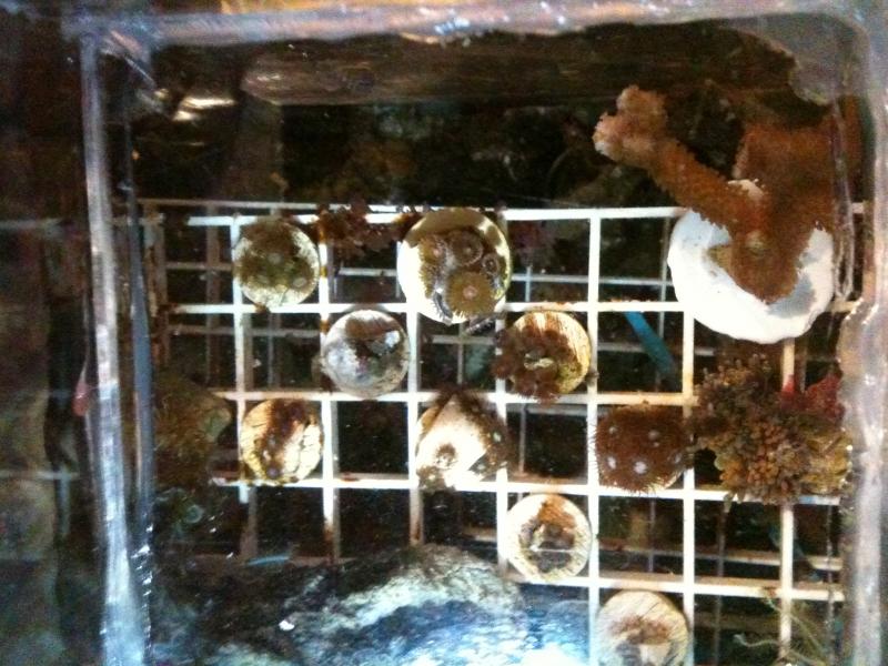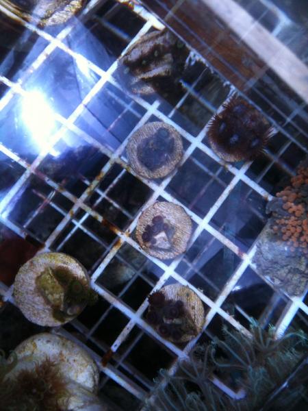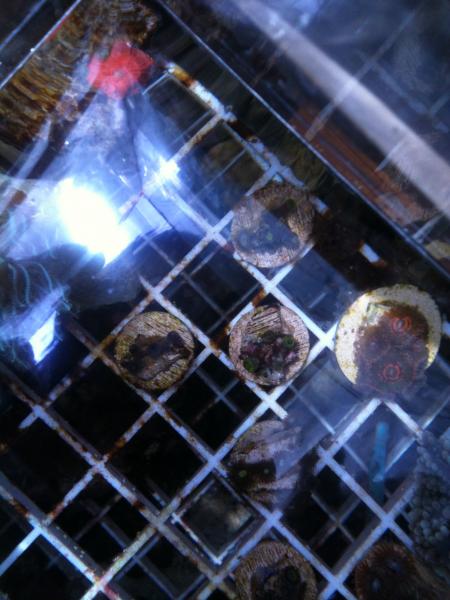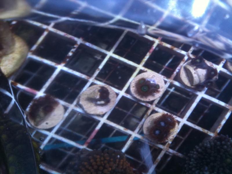To update how my zooanthids are doing, I've been doing water changes about once a week to two weeks. Sadly, the salinity has been creeping up and has probably effected the growth of my frags as well as other corals in the tank. The salinity was around 1.030 before I began adding freshwater to bring it down. I had also switched filters as the impeller in my previous filter stopped working. I'm now using an aquaclear filter which is my favorite filter brand anyway. Other than that, they get about a 1/2 teaspoon of rotifeast added about 5 times a week. I've tried feeding them pellet food, but they haven't taken it yet. Lastly, the Aussie invaders have been surprisingly successful, they've actually attached to the eggcrate they're sitting in. Here's the update on the frags: