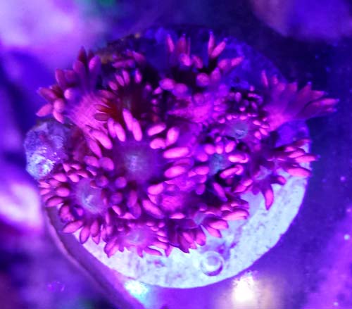 Zoanthids from misc coral raffle. Help ID please, I've looked on coralpedia and don't see it. Photo doesn't do color justice as these look flurescent pinkish orange.